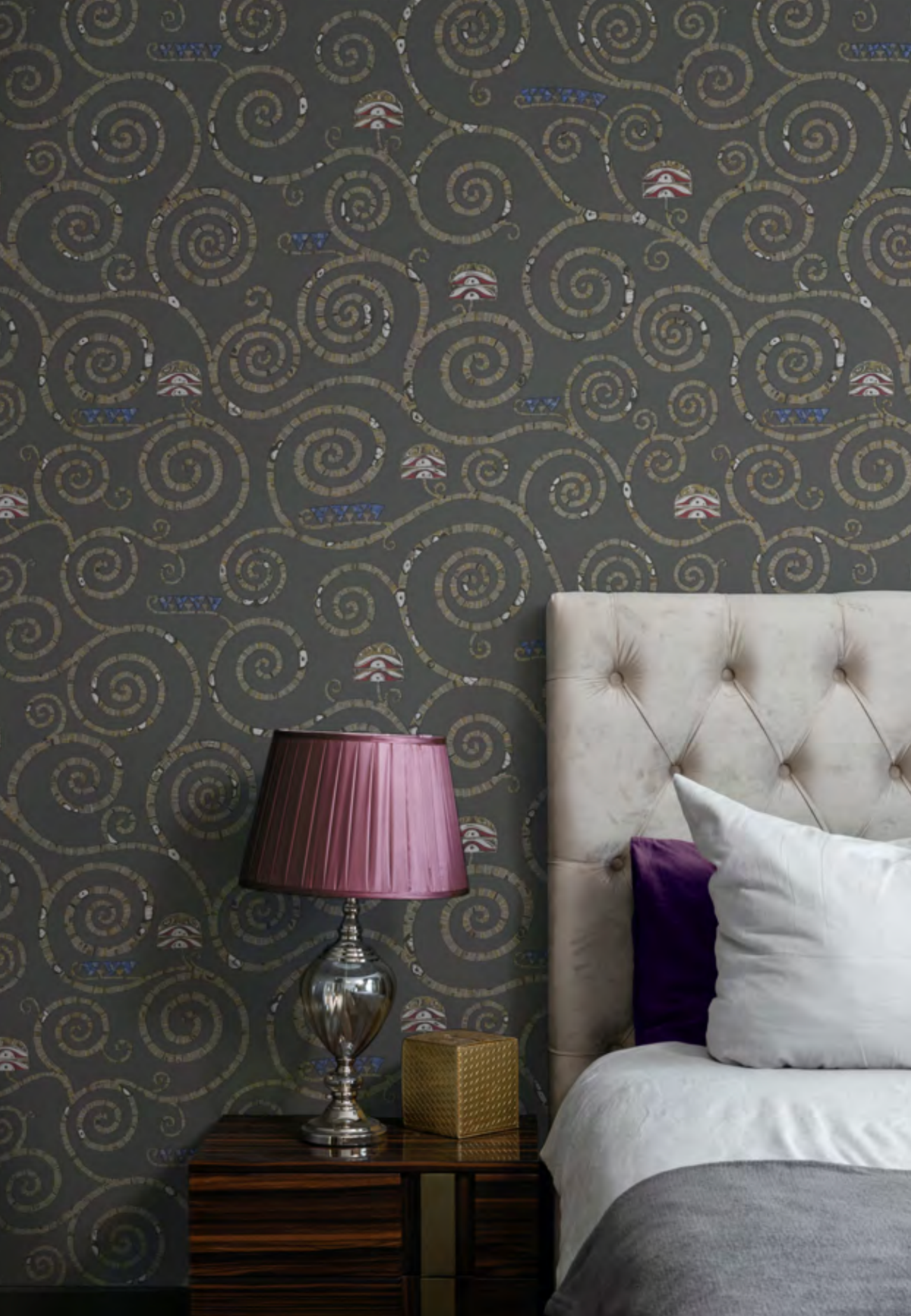 A tribute to Gustav Klimt. The tribute is based on the elaboration of his great works from the golden period, where he revisits the art of Byzantine mosaics. The result is a collection rich in true masterpieces, with luminous and brilliant relief enamels expressed through a high-thickness embossing. A meticulous and chromatically rich exploration: gold, blue, red expressed in mosaic patterns and murals clearly inspired by Klimt.